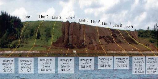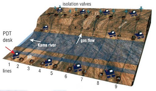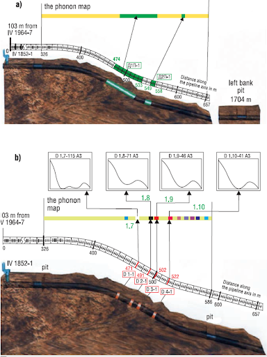 A good example of PDT applied on pipelines is a project performed on gas pipelines located on a landslide slope of Kama river, which are part of the 9-lines Uzhgorod corridor (see Figure 1). The arrangement of the system equipment is shown in Figure 2. Example layout of PDT inspection and monitoring results for Line 1 (Urengoy-Uzhgorod gas pipeline) on the landslide slope at the first (a) and second (b) stages of inspection is shown in Figure 3.